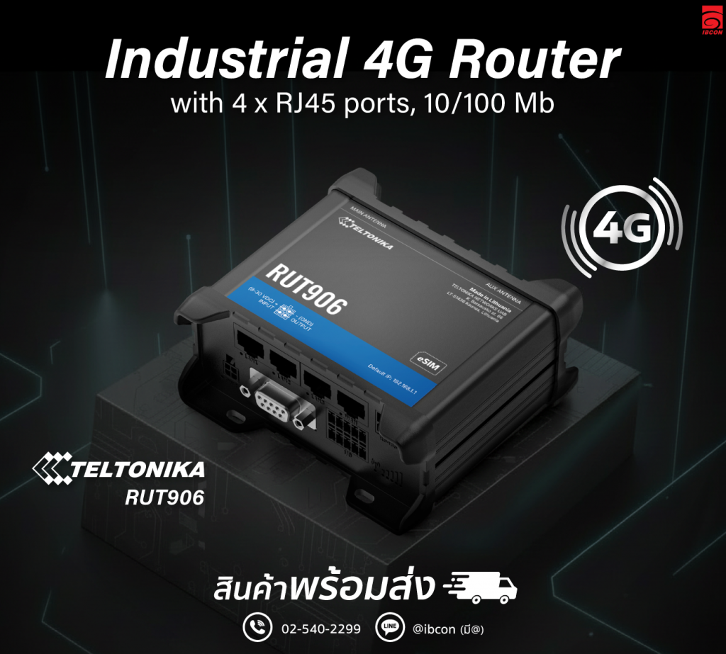 • RUT906 : Industrial 4G Router with 4 x RJ45 ports, 10/100 Mbps https://shop.ibcon.com/th/product/1275994/RUT906